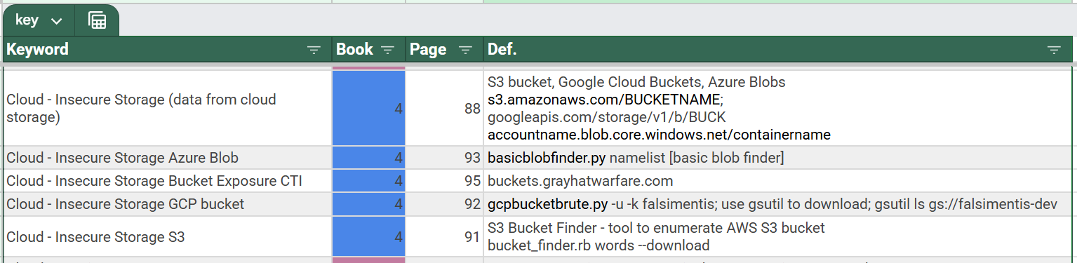 - Keywords, Book number, page references, brief description for fast lookup. Google Sheet with these columns.